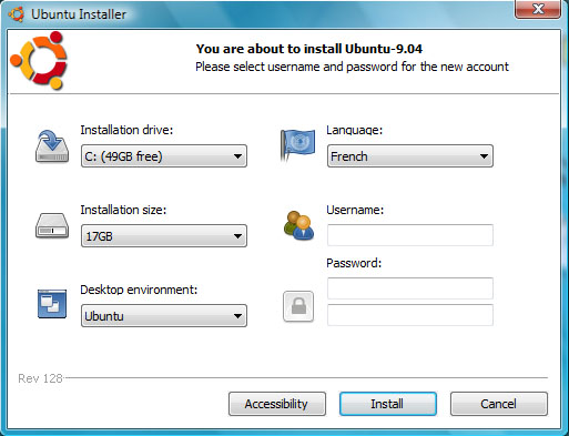 2) La fenêtre "installation" s'ouvre. Sélectionnez le disque où installer Linux, par exemple "C:". Sous "Espace dédié à Ubuntu", choisissez "8" soit 8Go au moins occupés sur le disque. Sous "L'environnement de", laisser "Ubuntu" et, sous "Langue", "French". Inscrivez un nom d'utilisateur et un mot de passe dans les cases correspondantes.